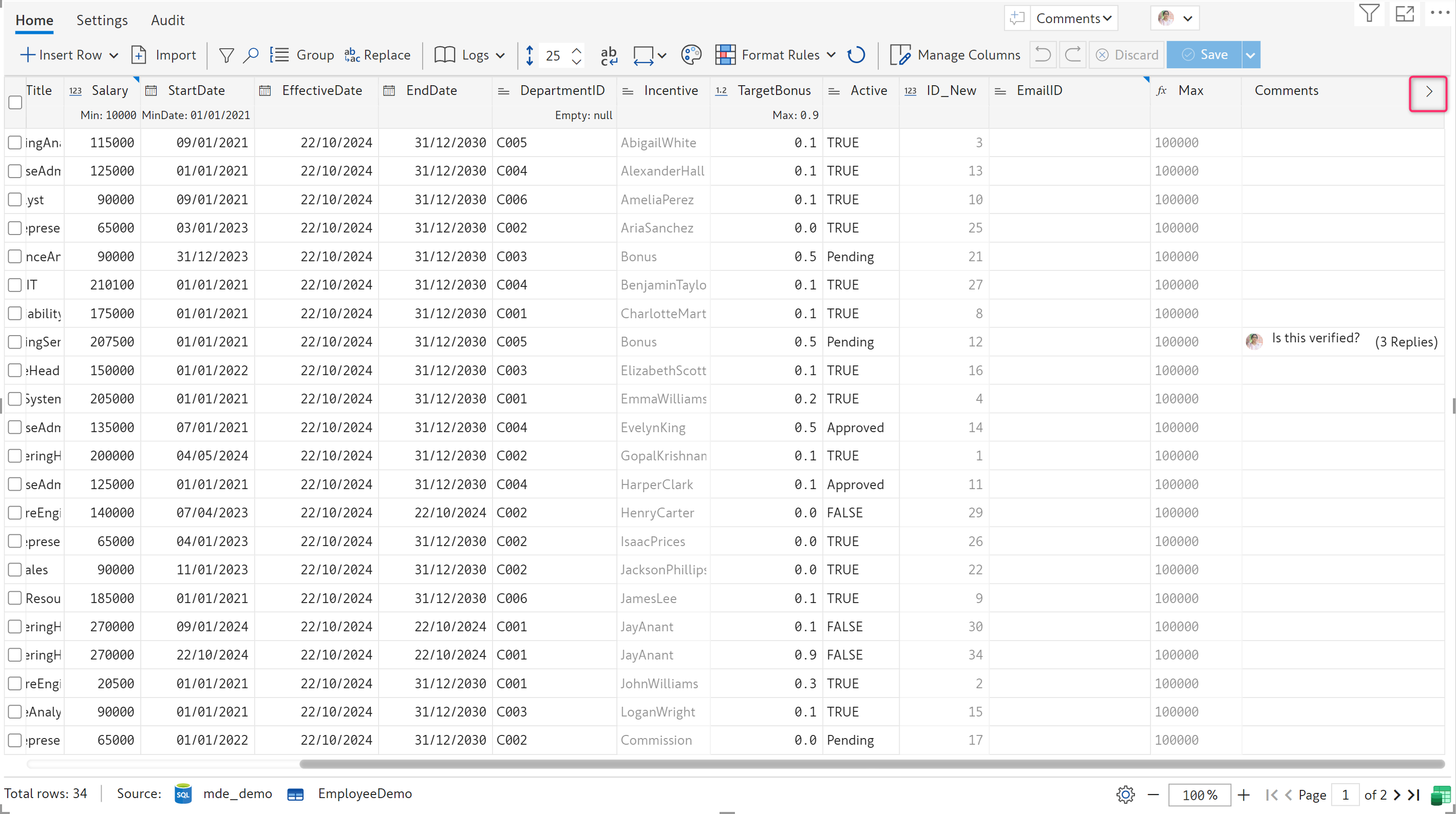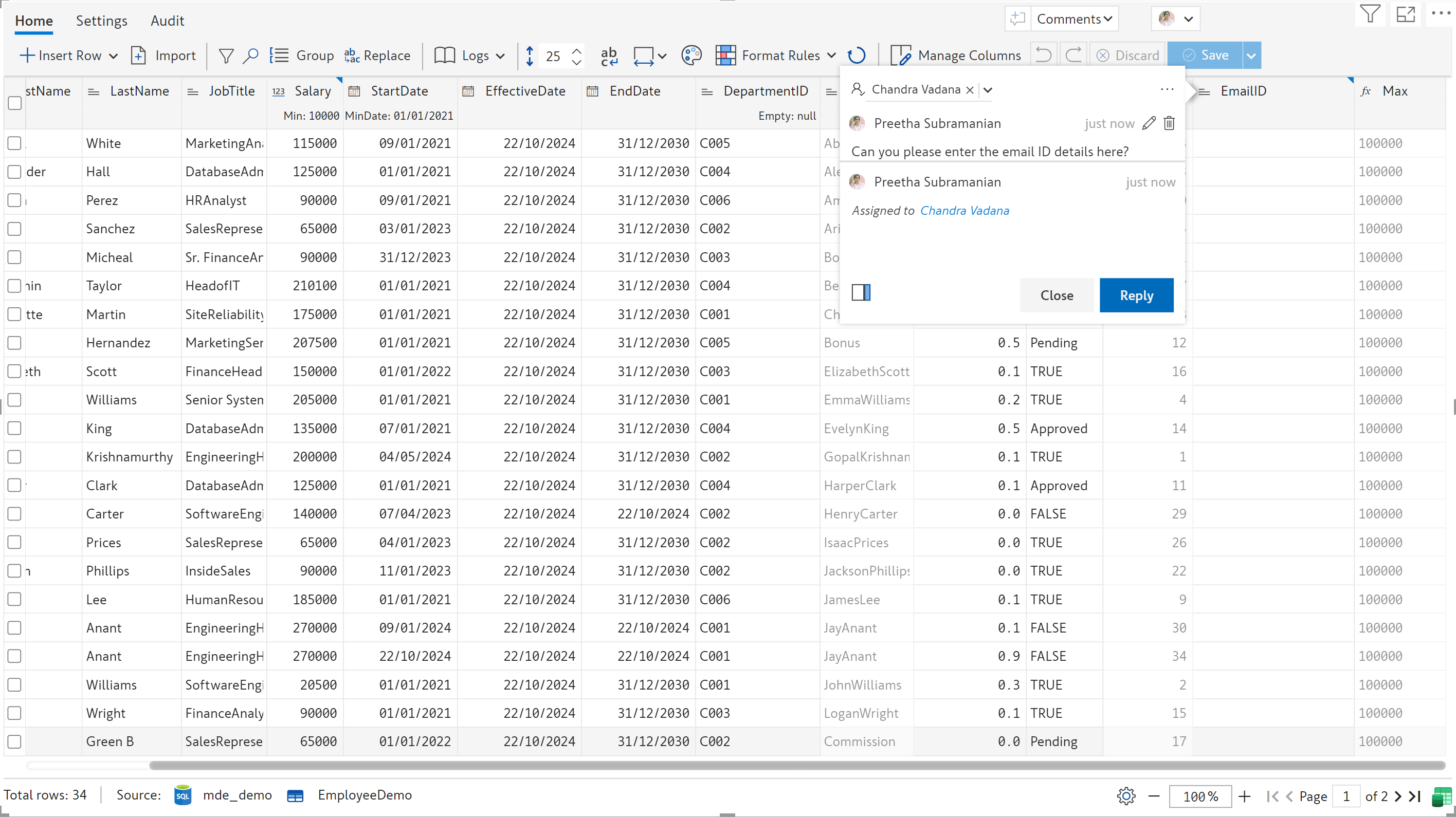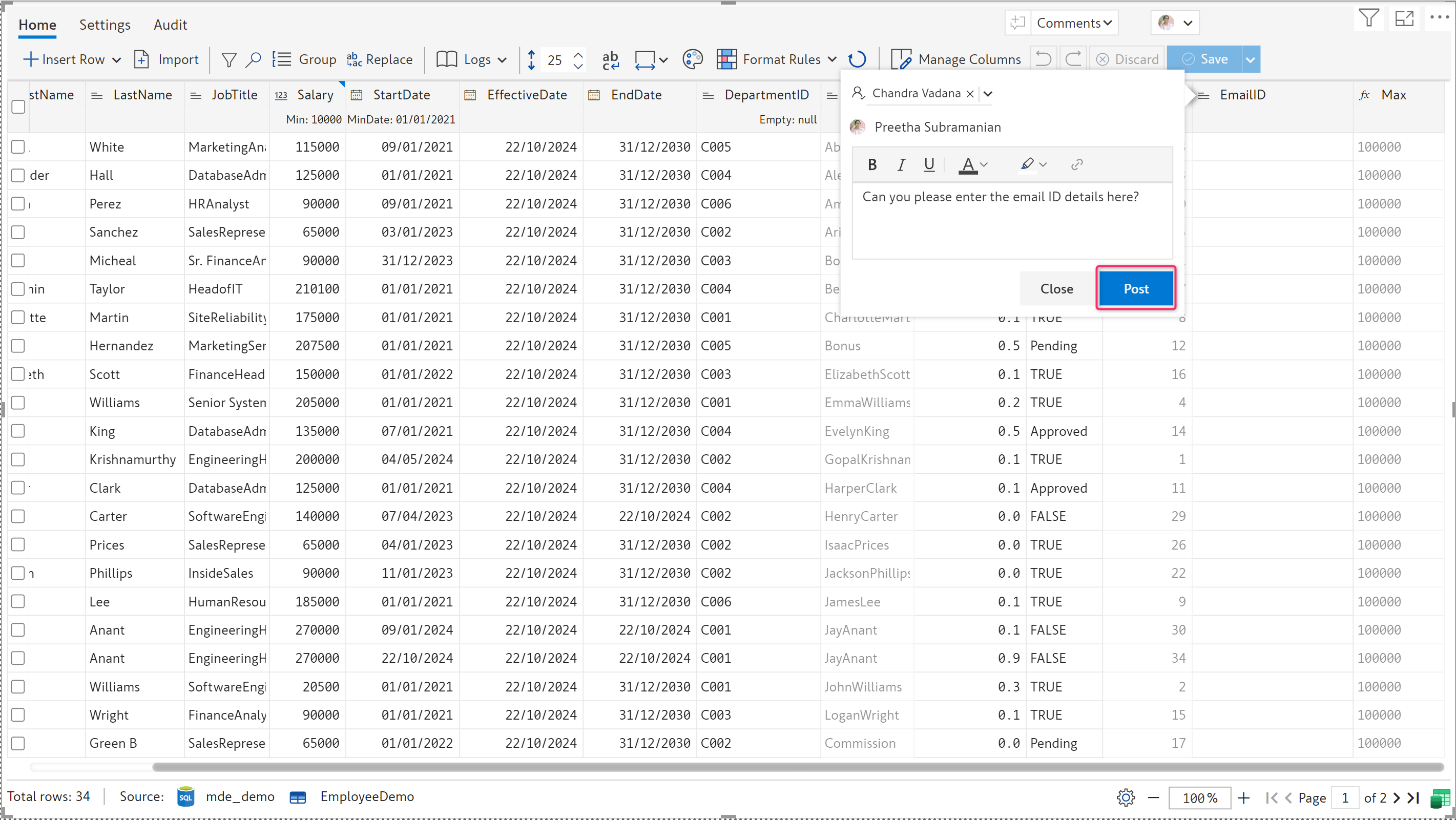 5. By clicking on the arrow highlighted, you can expand/collapse the task status and assignee columns. Based on the selection in the comments editor, these columns get populated automatically.