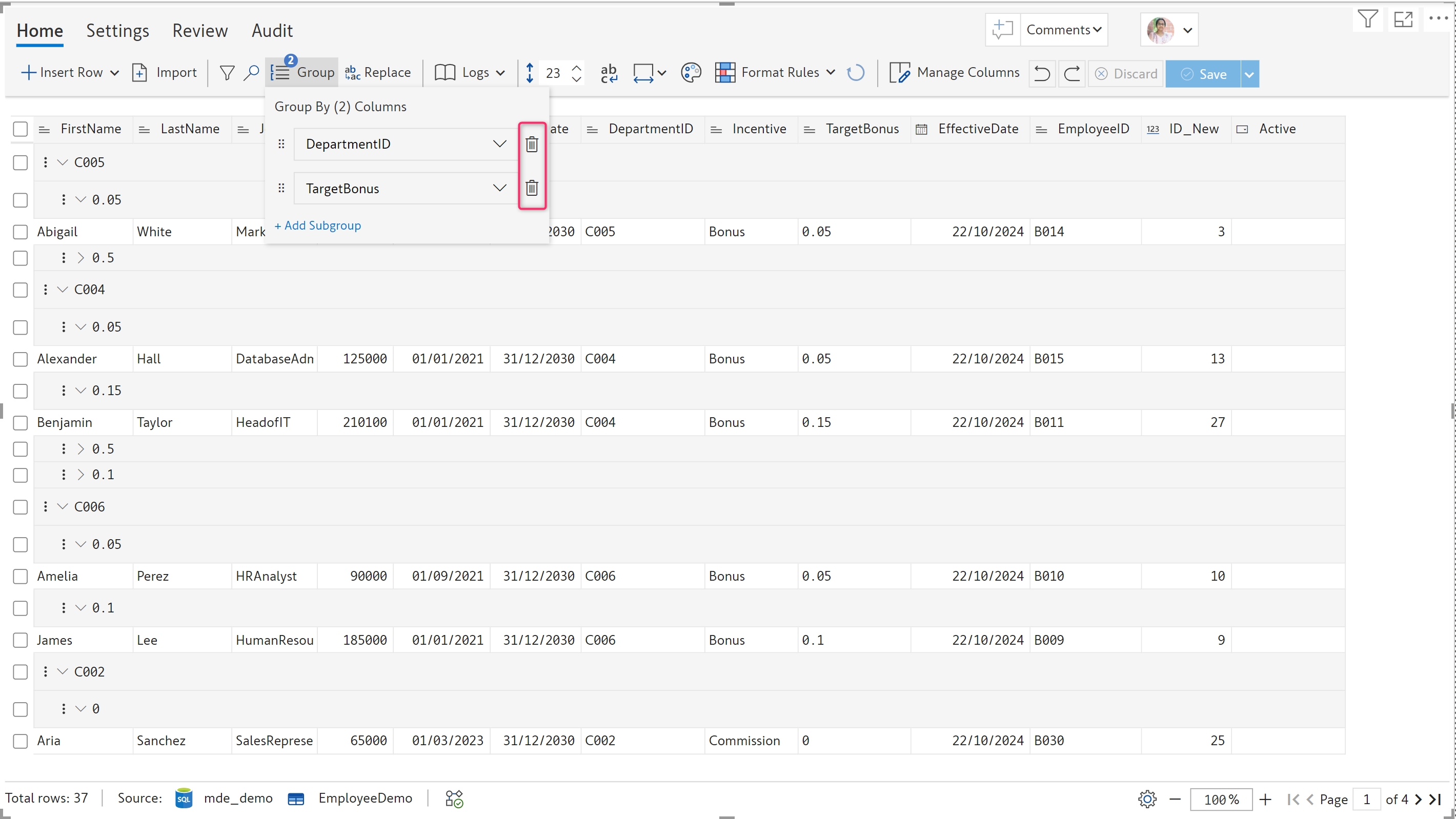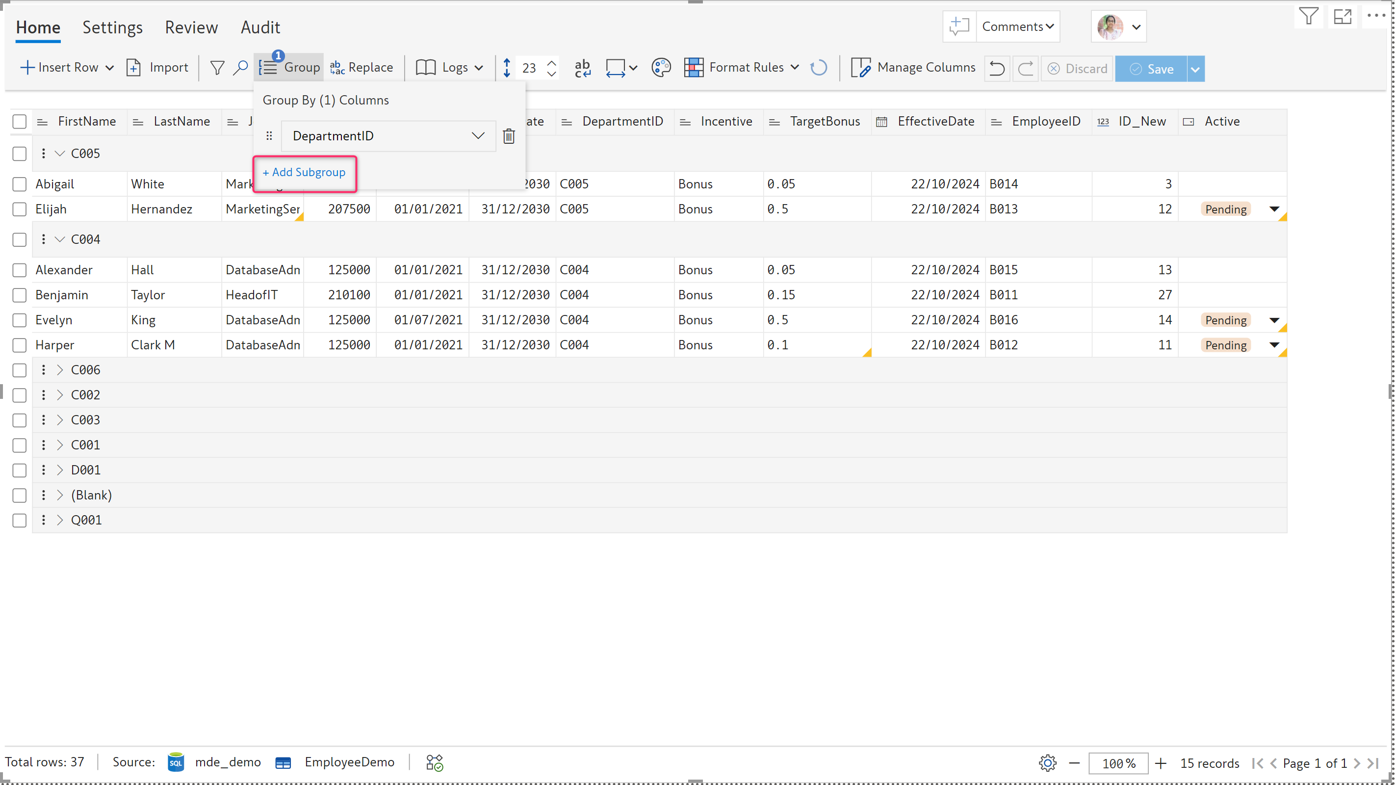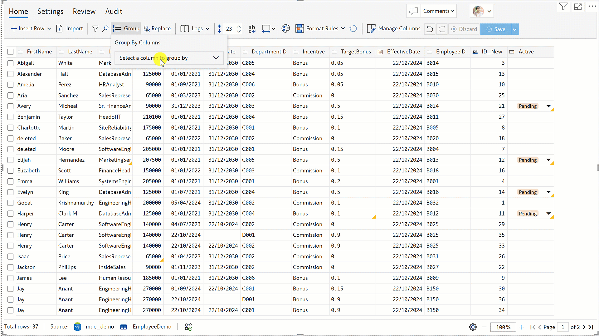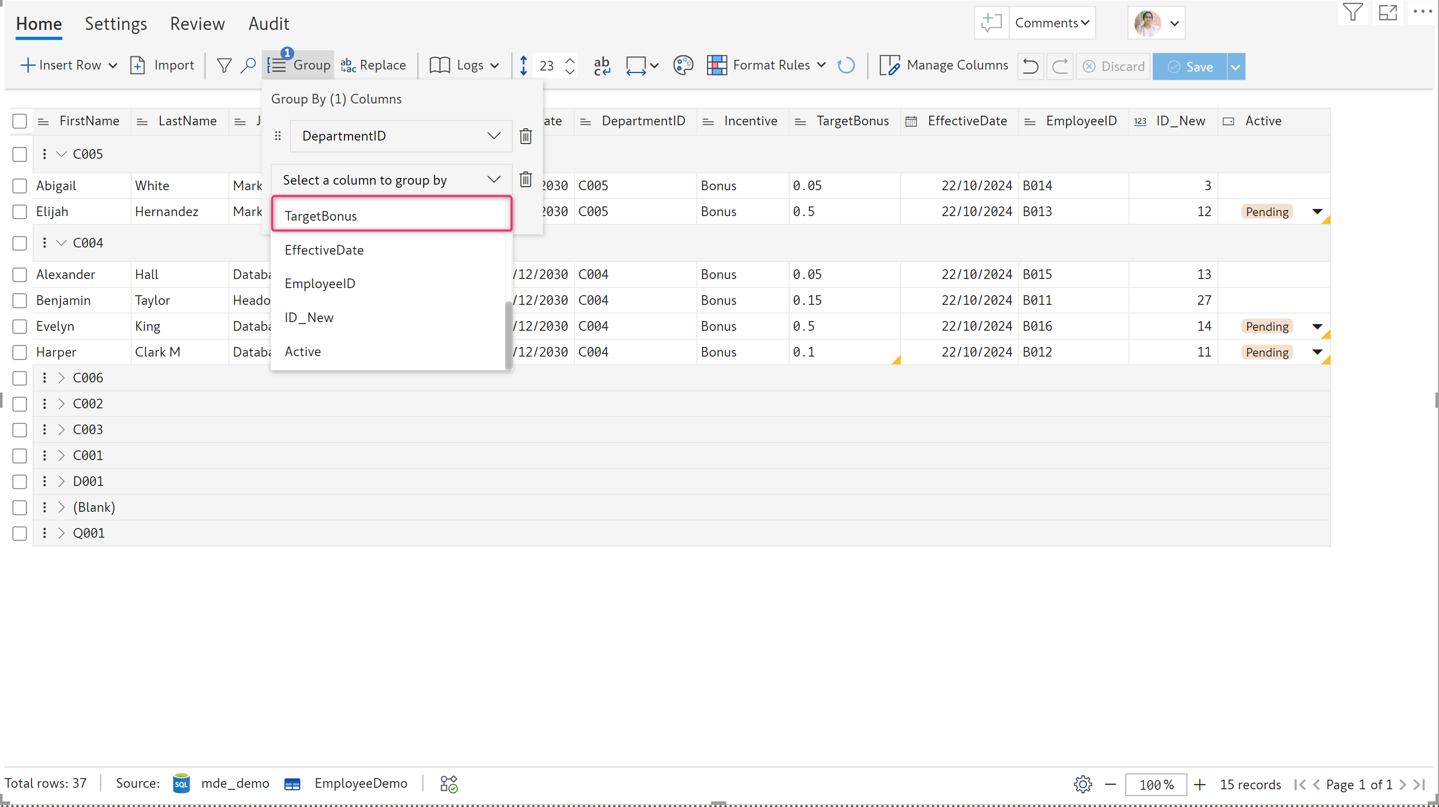 Select the column to group by. In the example below, we are grouping rows based on the department ID.