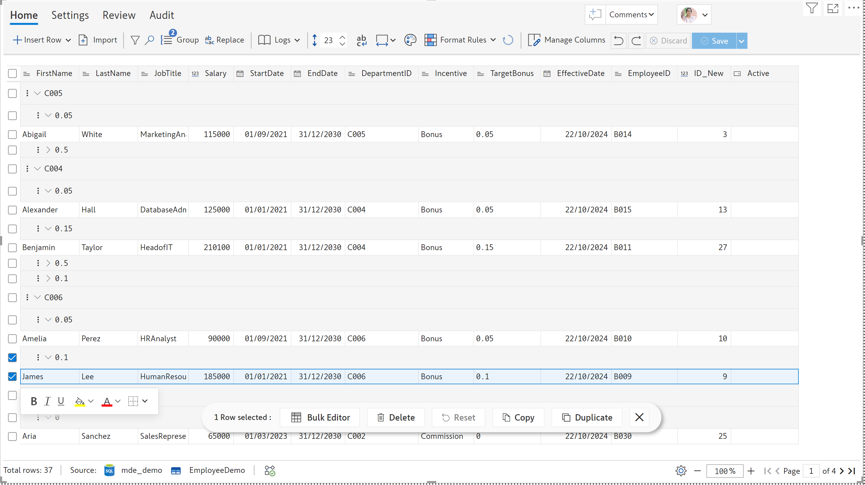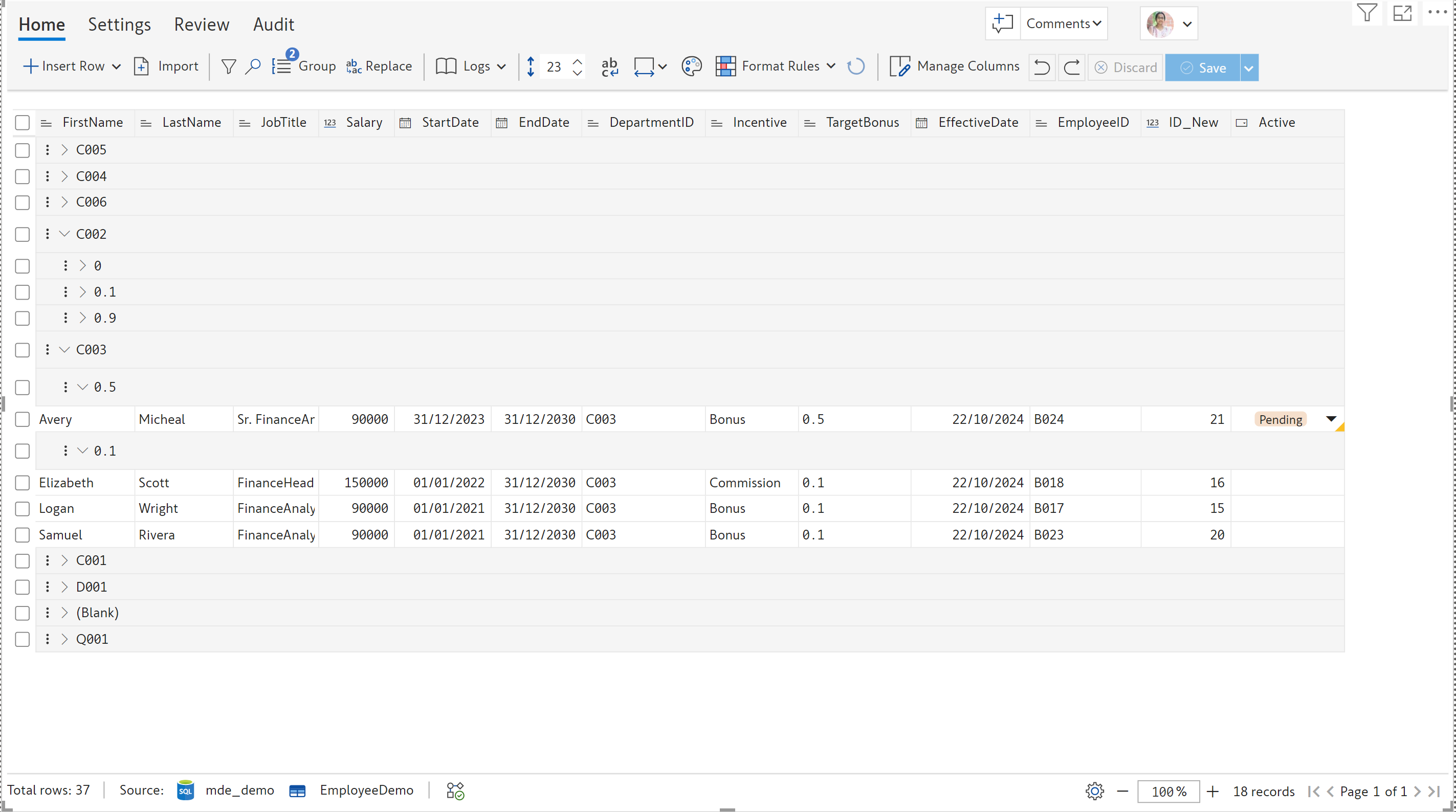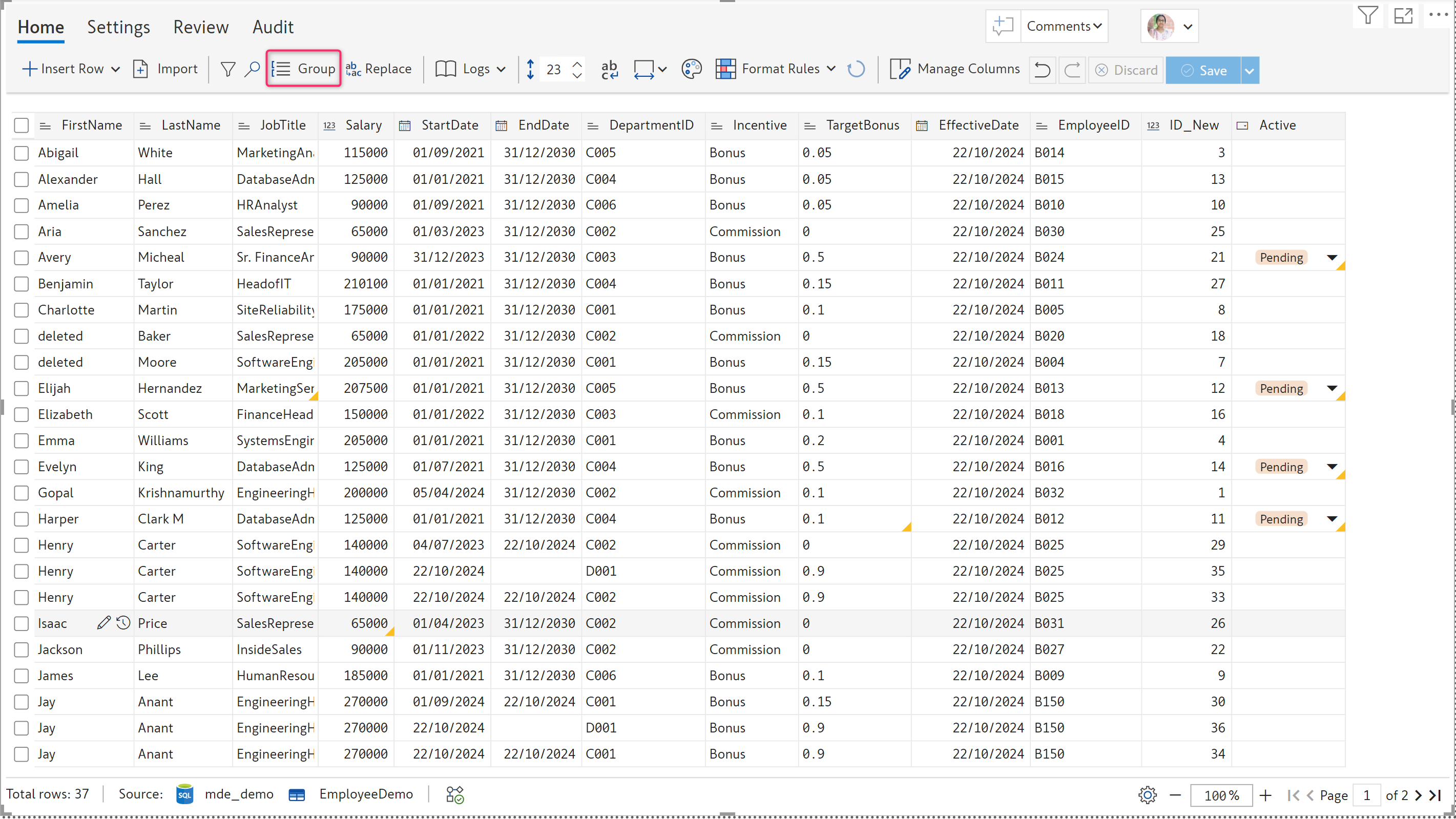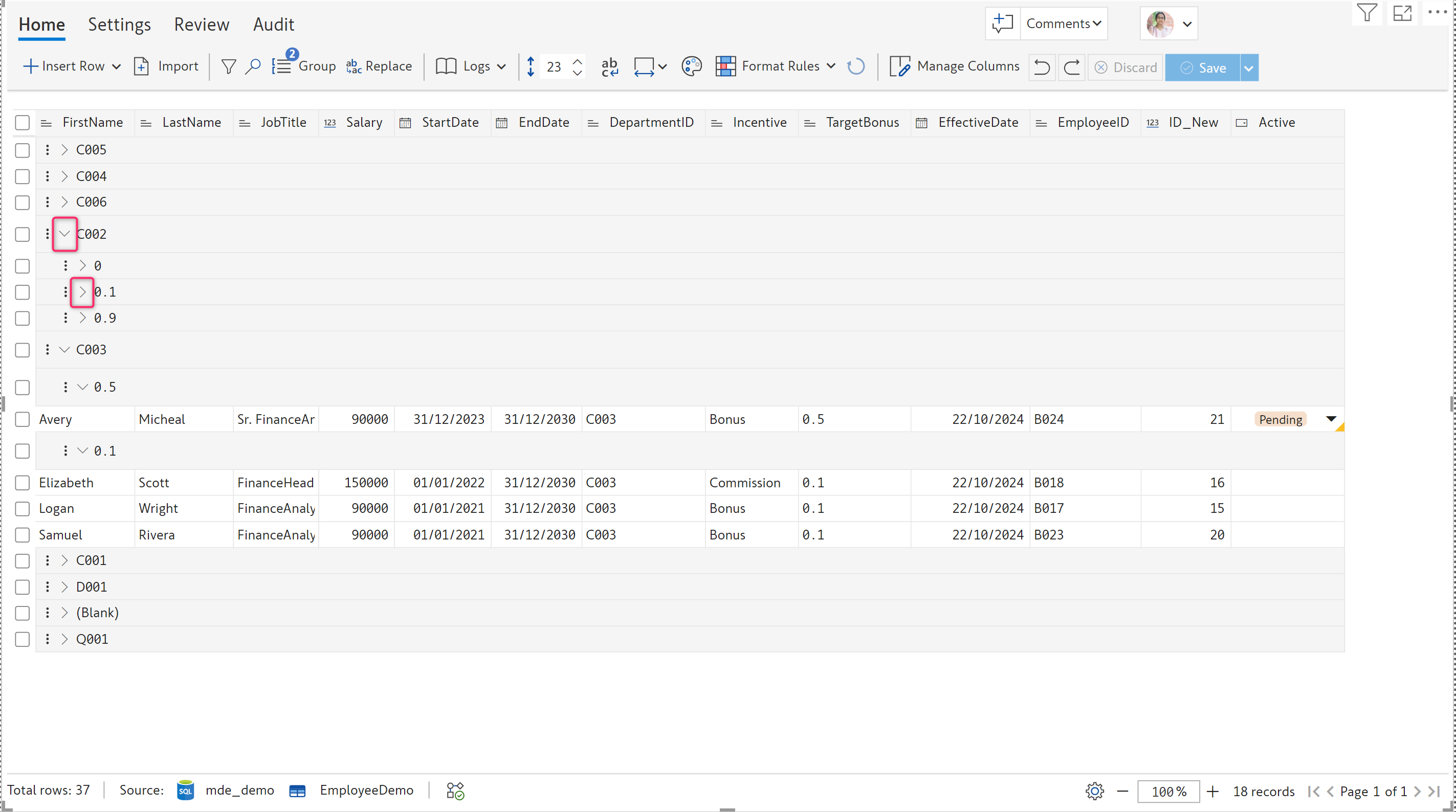 The 'Group Rows' feature in EDITable lets you group the rows based on a selected column. Rows with the same attributes are grouped.
