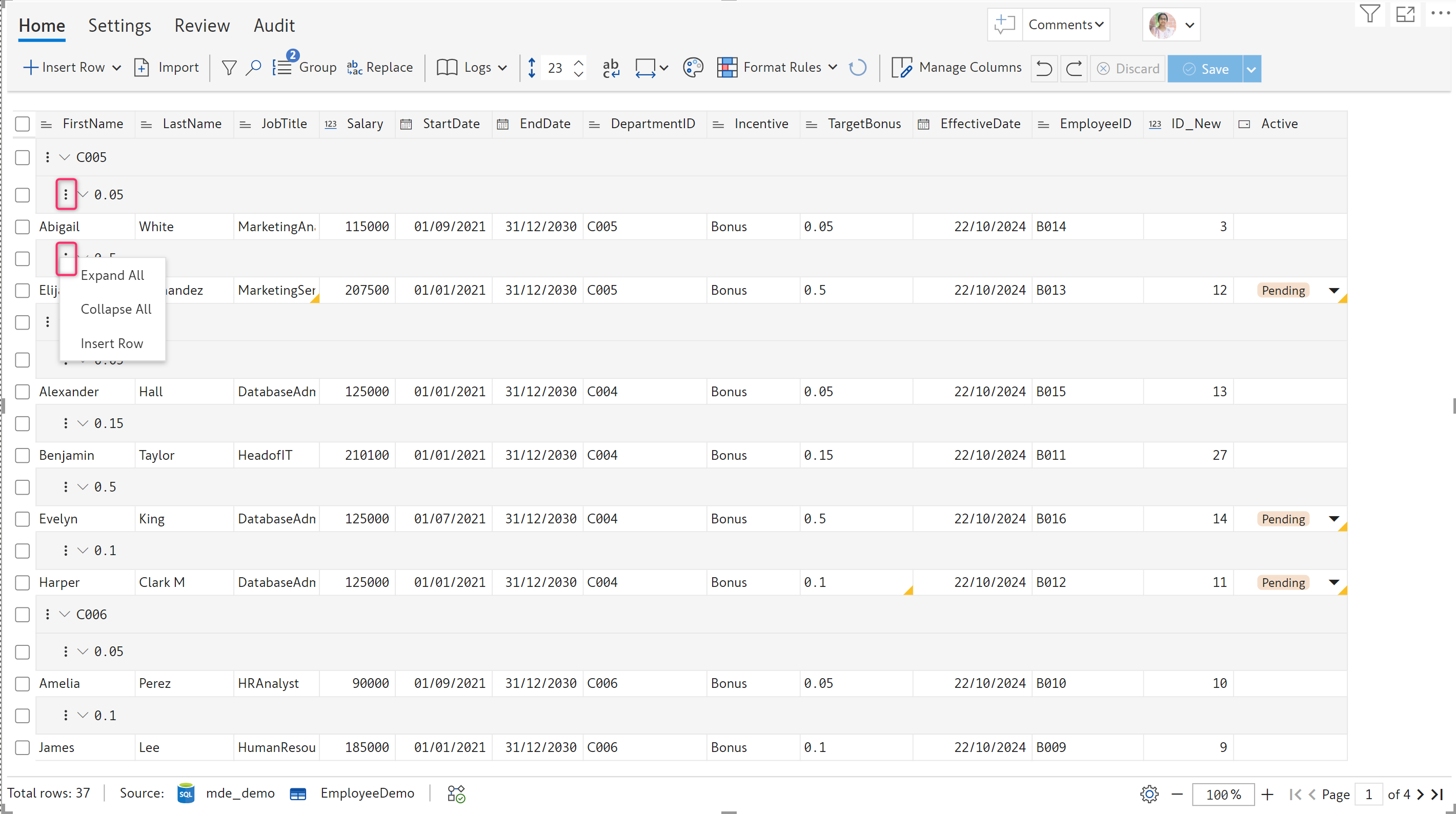 Use the three-dot menu to expand all/collapse all or insert a row.